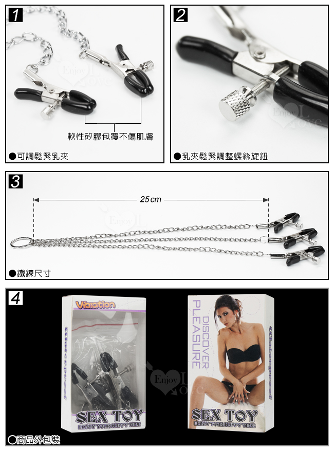 【使用方法】將乳頭夾夾在乳頭上+陰唇夾,調校鬆緊至舒適位置即可。