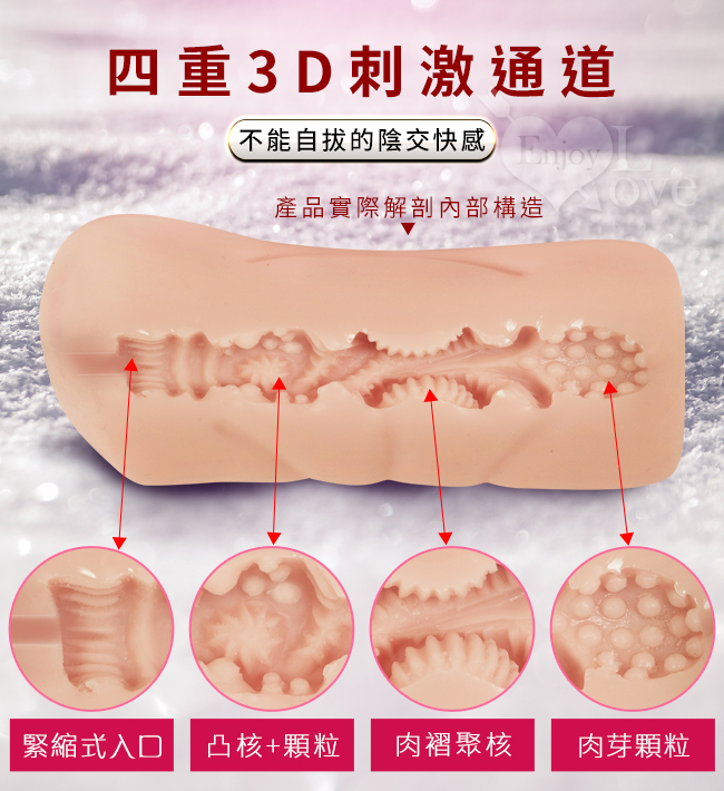 *內部立體3D設計了很多各樣凹凸螺紋、大凸粒,小顆粒等等組合,抽插活動實體時將給予強力的刺激感。