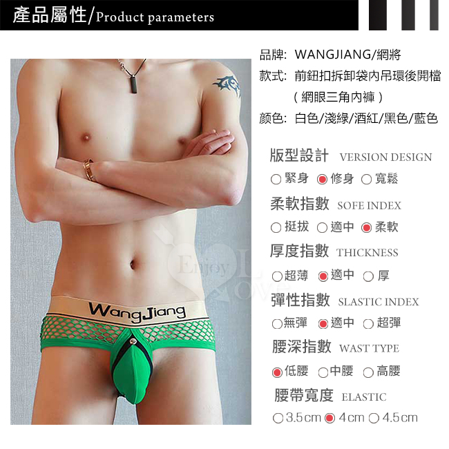當前位置: 首頁 > 男士豪邁內衣/褲 > 三角褲 > 【網將WJ】前鈕扣拆卸袋內吊環後開檔 - 網眼三角內褲﹝酒紅 XL﹞