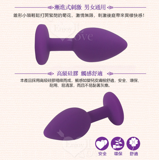 光滑的柔細表面,避免表皮的摩擦而受傷,同時進出更容易,最適合後庭初試者使用,可塞入私密處或肛門使用。