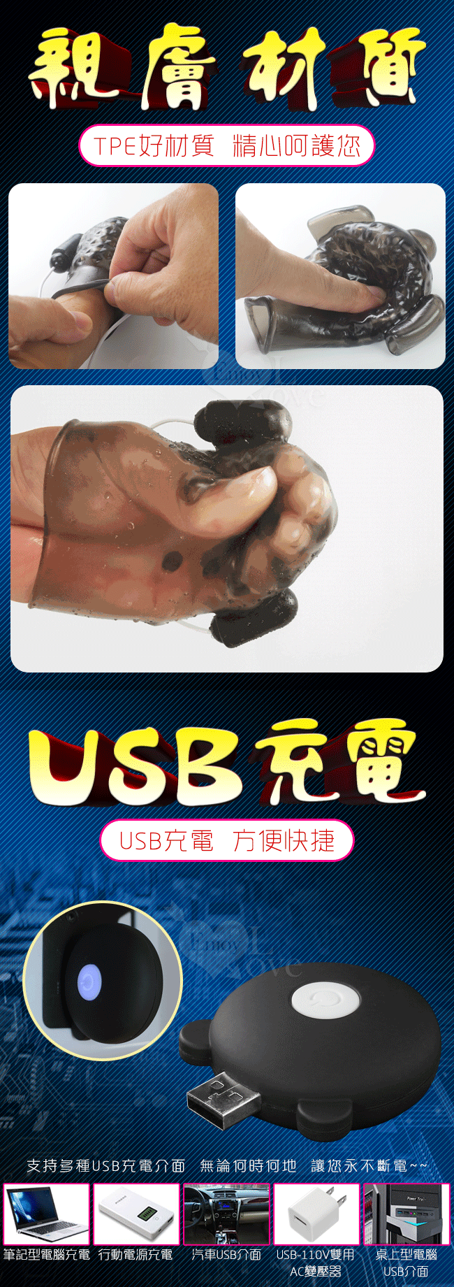 此款採用USB直插充電,讓續航玩趣更加盡性喔~教您一步步成為自信久戰大男人!!