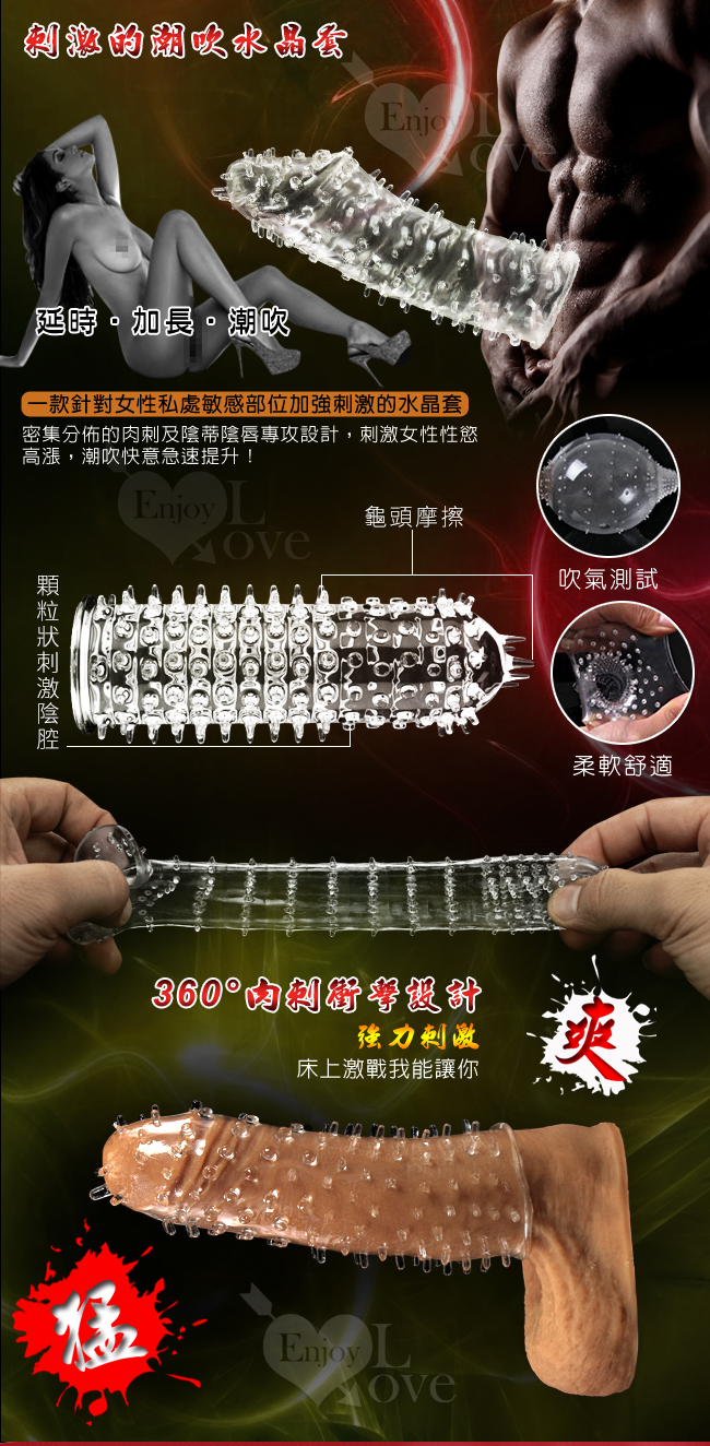 套身佈滿特殊狼牙芒狀設計,保險套的穿戴方式,方便安全,可延伸你的作戰縱深,那些突起的芒刺更能撓動深沉快感,啟發高潮,讓她從此愛你愛到骨頭裏。