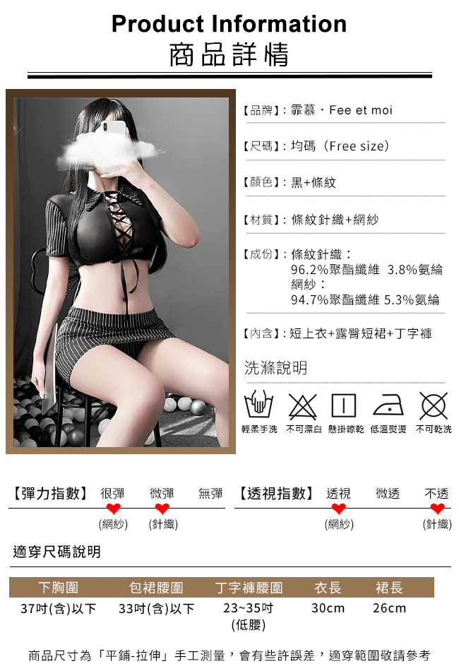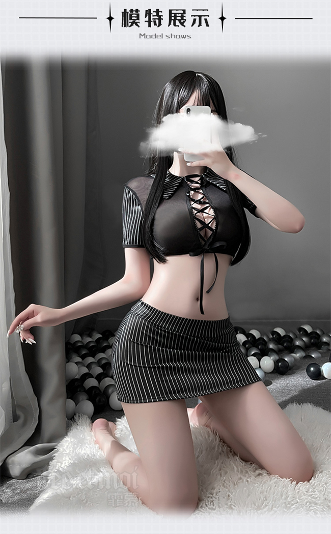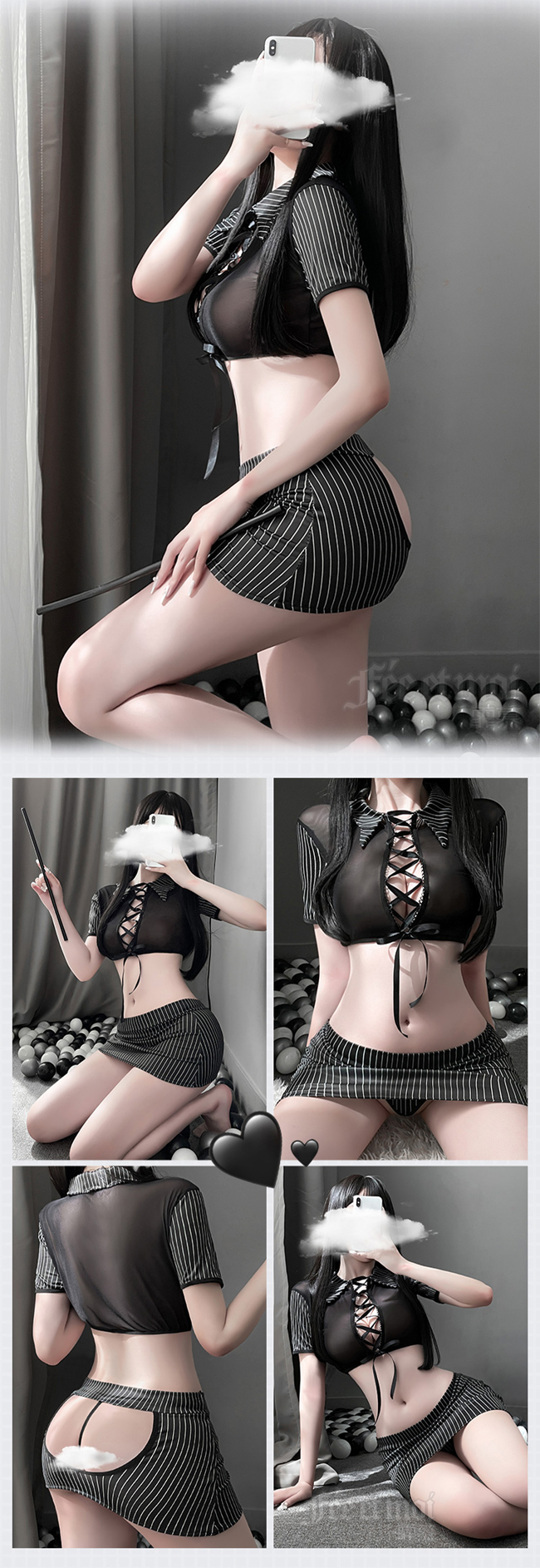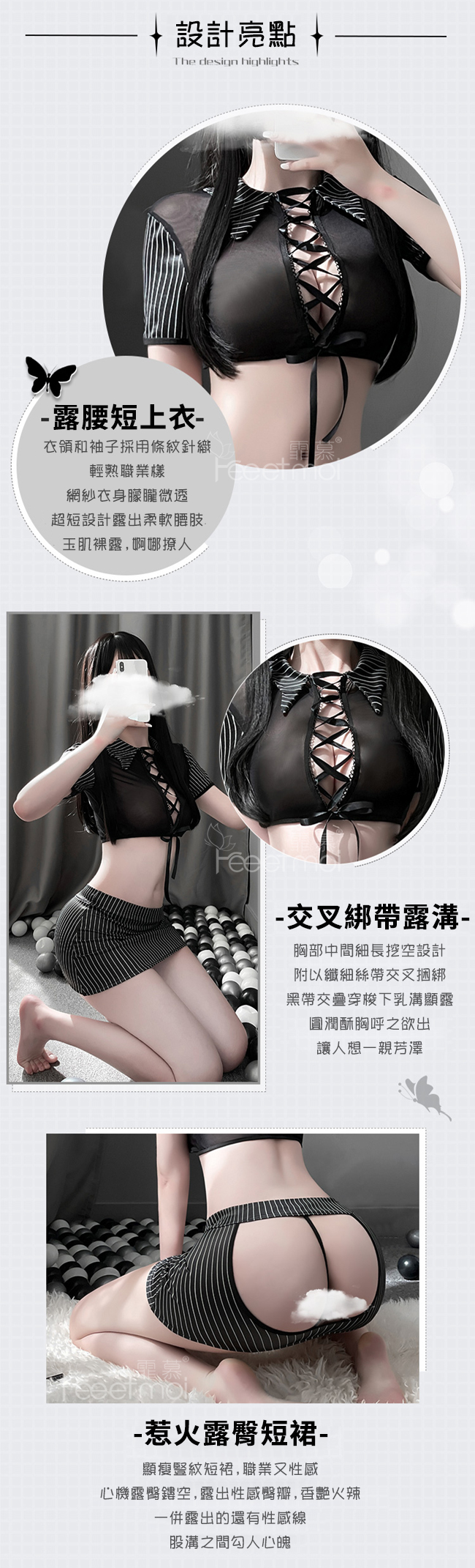 當前位置: 首頁 > 角色扮演服 > 辦公室系列 > 《FEE ET MOI》秘書角色扮演服!交叉鏤空網紗短上衣豎紋露臀迷你裙三件組