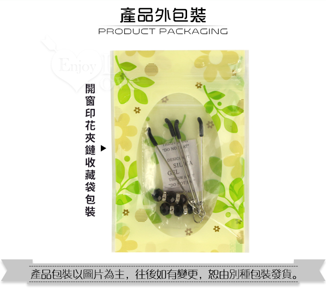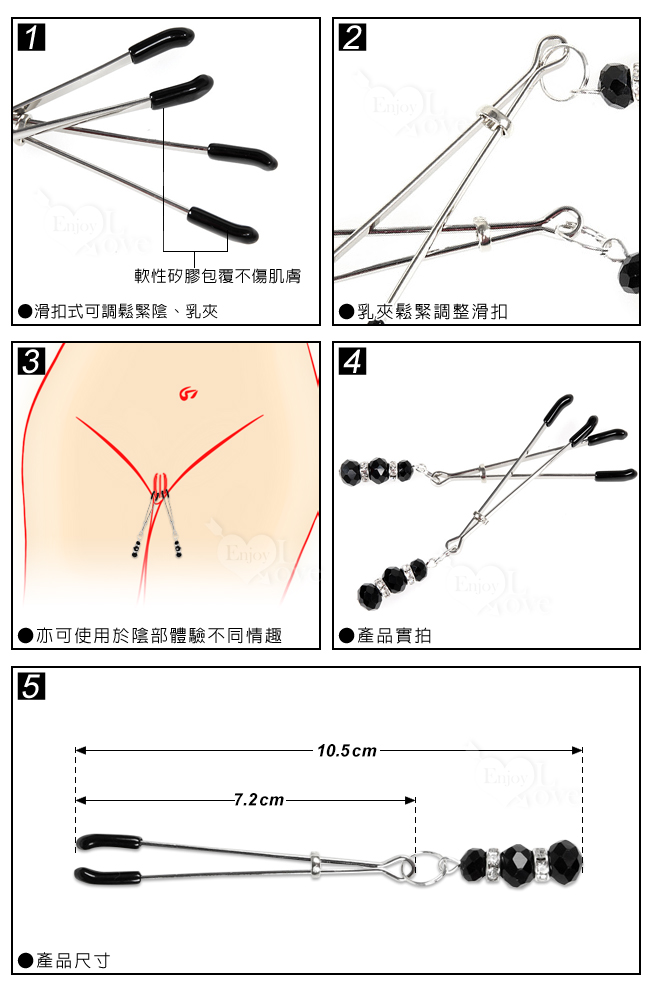 也可以在扣環上懸掛自己喜愛的物品,再運用兩個夾,夾在乳頭或陰唇(蒂)上,隨著雙環的晃動,撩起無限情慾。