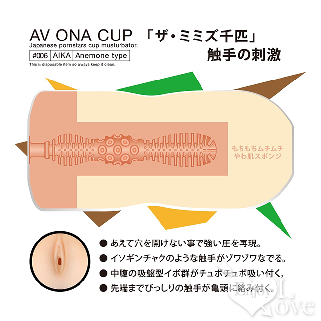 日文簡述: イソギンチャクのような触手が無数に配置され、ゾワゾワなでるような刺激と、中腹にある吸盤型のイボイボ群のチュポチュポ吸い付くような刺激が楽しめる、AV女優「AIKA」とコラボレーションして作られたオナカップです。柔らかな素材と男性の誰もが好きなミミズ千匹の触手刺激と、吸盤の吸い付き刺激が堪能できるだけでなく、空気穴のないタイプのオナカップだから、強烈なバキューム感まで楽しめます。先端までびっしりの触手が亀頭に絡み付く快感は、オナカップとは思えない充実感。AV女優コラボオナップ「AV ONA CUP」は、新作が続々登場している大人気シリーズ。全種類を揃えて使い比べて楽しんでも良いですね。