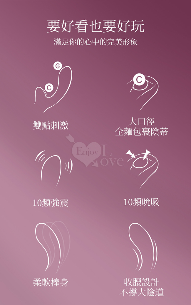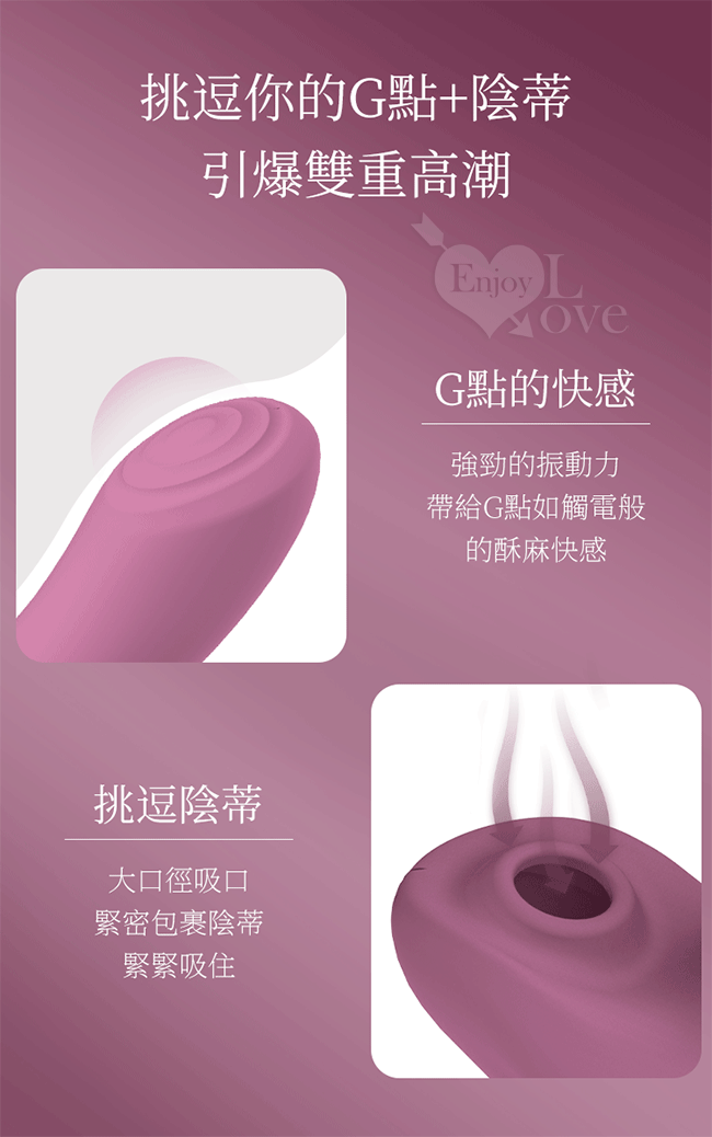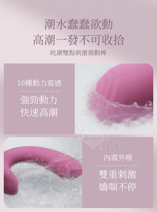 外吸陰蒂內震G點激爽雙重高潮,吮潮雙點刺激震動棒,引爆雙重高潮。大口徑壓力波吮吸全面包裹強力吸,輕輕的一觸便能牢牢的吸住你的陰蒂。流線弧形棒身,入體貼合G點大面積紋路接觸頭,不放過任何敏感點。且棒身可彎曲親膚矽膠,可隨意調整角度,柔軟有彈性