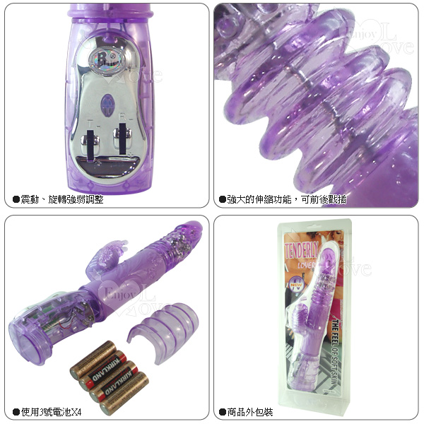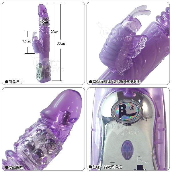 強力電動伸縮按摩棒,可同時震動陰道、陰核,震動力強勁!耐用、耐操,同時可微調震動,還會前後戳插,遠遠超越了男性陽具所能發揮的體能極限,幾乎讓人無法一手掌握,再怎麼強烈的燎原慾火,也會被它所撲滅夷平。 中間的環紋部分不停地伸縮、抽動,在您的私處進出、摩擦;小蝴蝶長長的雙觸角震動拍打、添吸著您最敏感的陰蒂……