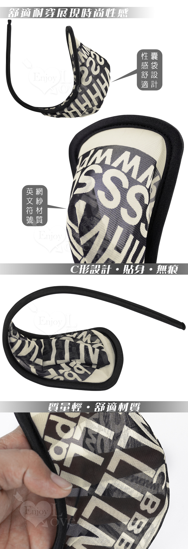 【描 述】男款C字褲比女款要大一些,前面部位為激凸大囊袋,根據男性器官特別設計,穿著舒適,且不易掉下。櫃框架為高彈性