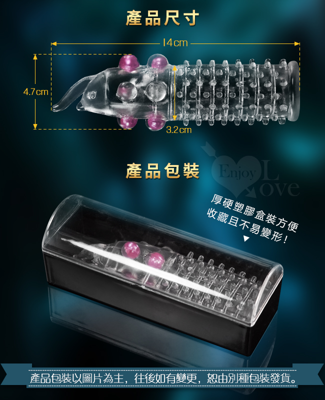 男人戴上後,變身為真正的入珠狼牙棒!具有非常明顯的加長加粗效果!同時敏感度也會降低,金槍永不倒!同時渾身佈滿的軟刺還能帶給女性無比強烈的摩擦刺激,讓她享受直上雲霄的夢幻快感!