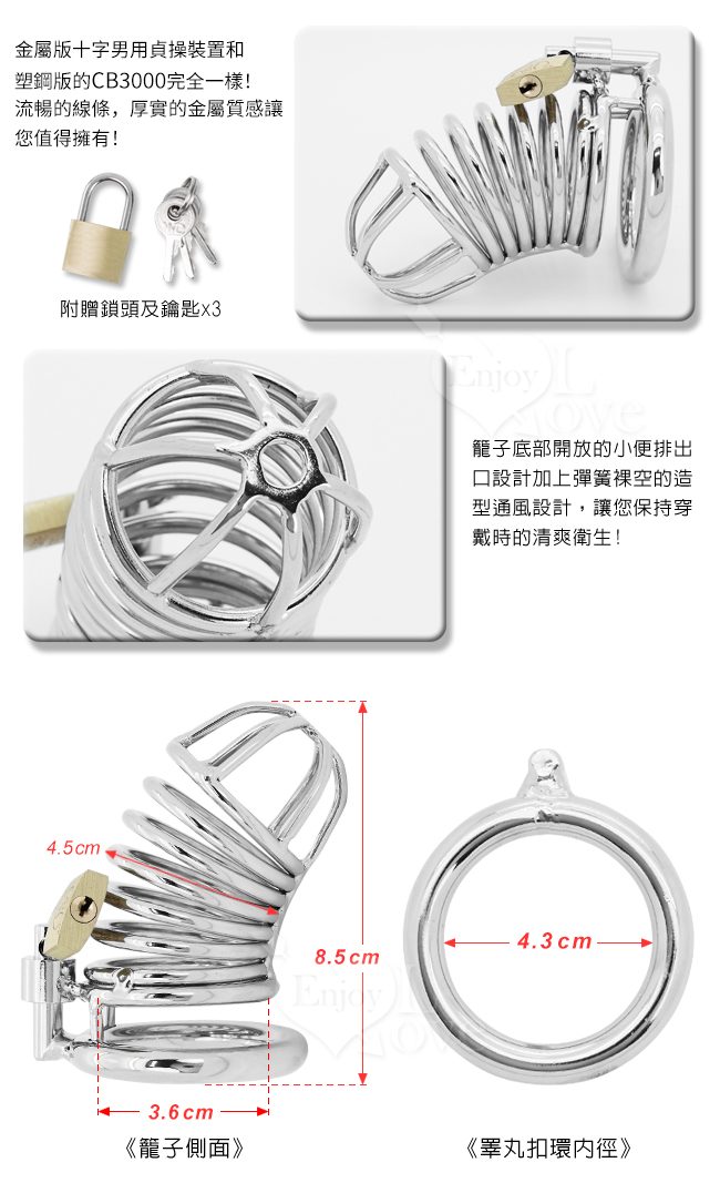 ※ 睪丸扣環內徑為4.3公/寬約0.8公分;十字籠子內直徑為3.6公分;長約8.5公分專為亞洲人而設計。
