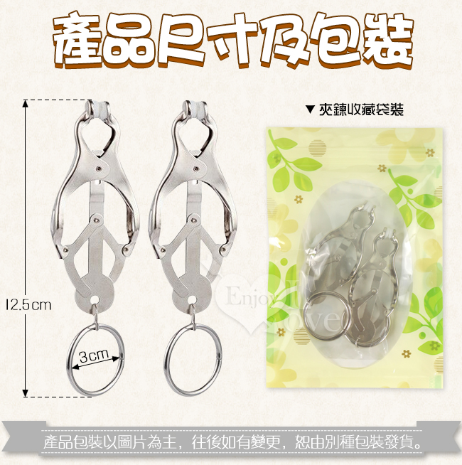 加重環上可以懸掛自己喜愛的物品,再運用兩個夾,夾在乳頭上,隨乳房的顫動,雙環在胸前的晃動,撩起無限情慾。