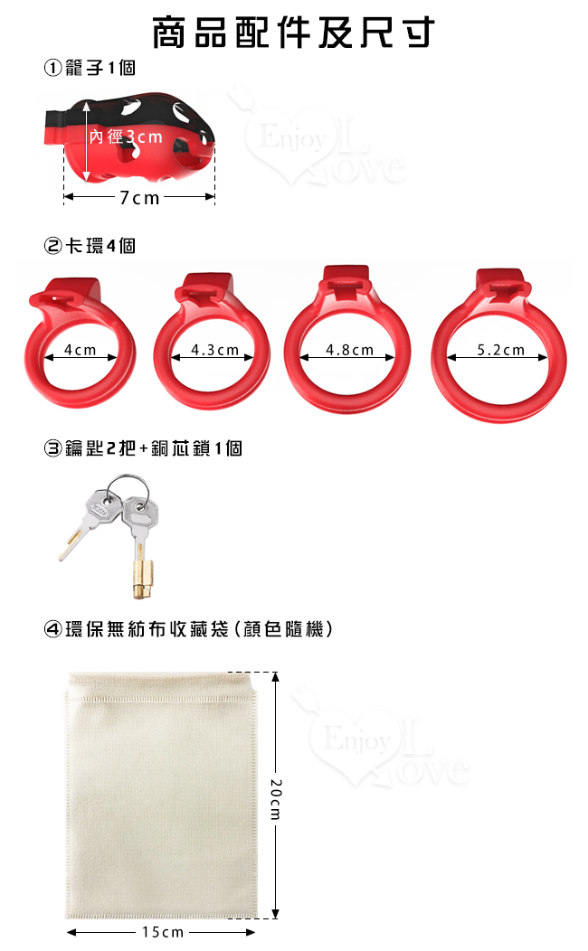 【尺寸】亞洲版 M (適合陰莖中大者來使用),籠子長度約7cm,內徑約3cm / 卡環尺寸:4cm,4.3cm,4.8cm,5.2cm 如圖所示