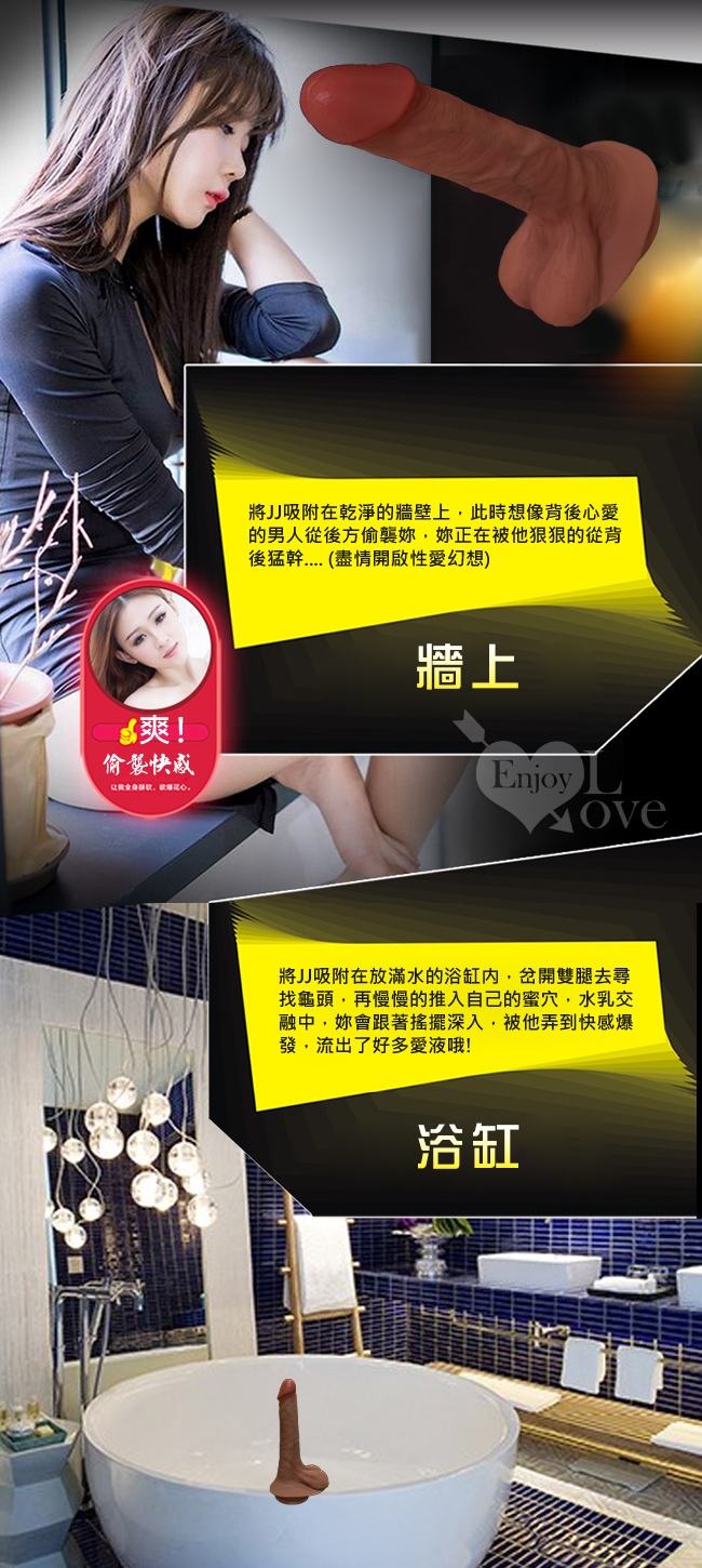 Enjoy Love酷龍系列極緻逼真按摩棒,以真人老二倒模打造,細膩的完整重現真人老二的肌膚、逼真的經絡跟逼真的陰囊都猶如真實的陰莖,採用雙層液態矽膠,是東方女性接受度最高的柔軟硬度,底部還設計有吸盤底座,可吸於牆上、床上,任何的光滑表面,多種玩法任妳玩,還可以開水加溫,讓體溫如真人一般,讓妳性愛過程更有樂趣喔~