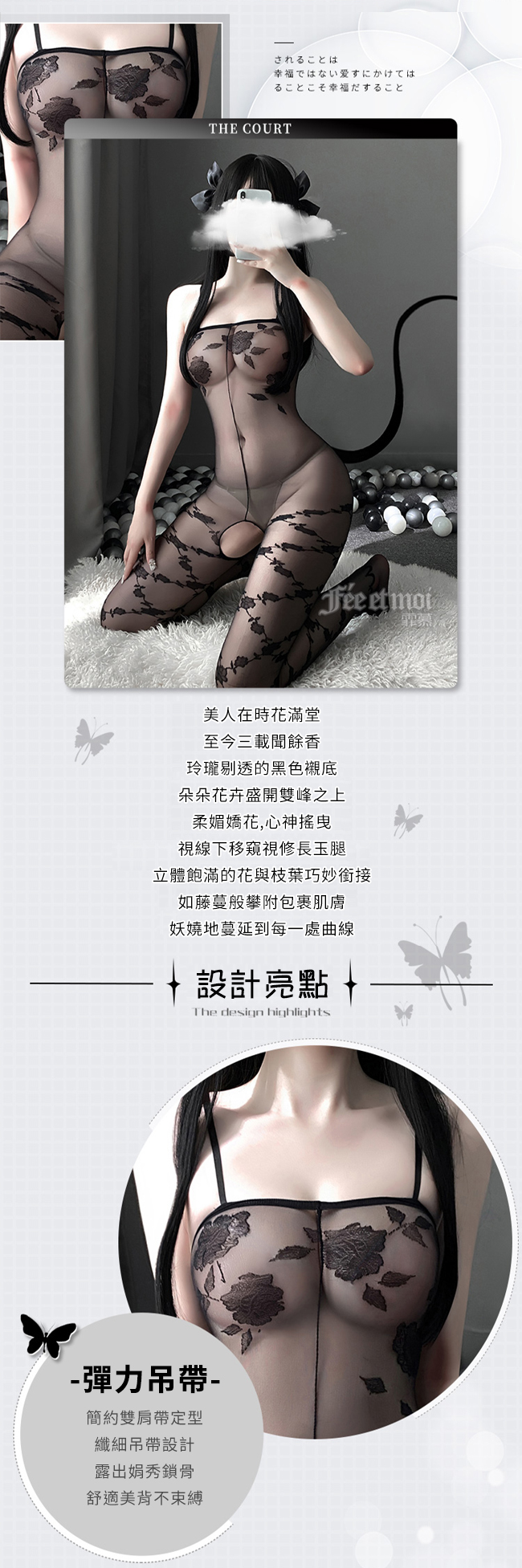 當前位置: 首頁 > 女性情趣內衣/褲 > 狂野連身衣 > 《FEE ET MOI》絲襪連身衣!彈力肩帶黑玫瑰刺繡花朵纏繞玉腿開檔裝