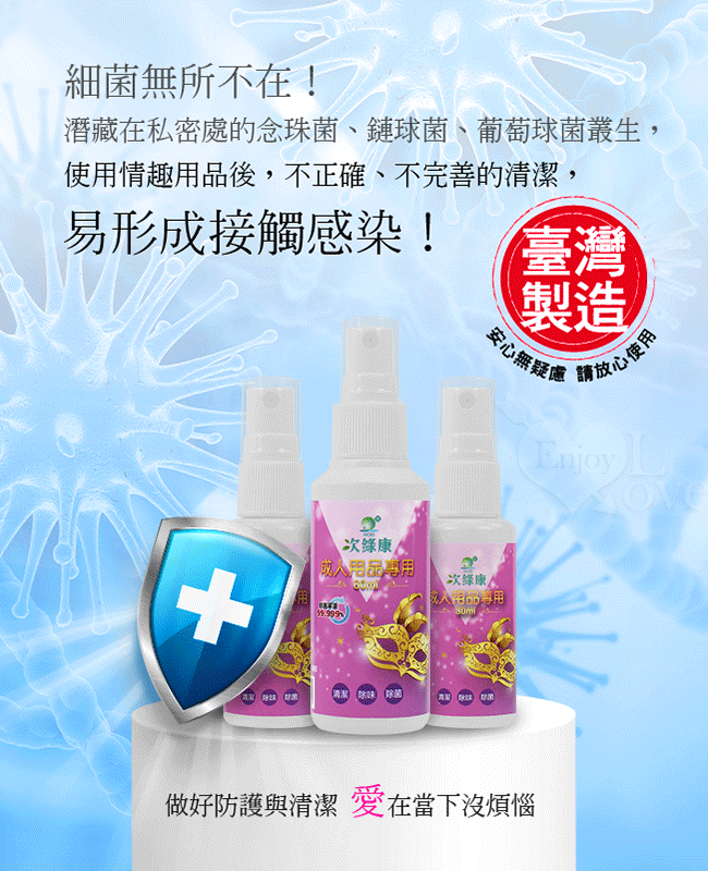 ※ 台灣知名品牌全家康生產製造⚹次綠康⚹經過層層把關及實驗檢測,專為情趣(成人)用品研發而成,不管是男性或女性用品都適用的貼心產品,敬請國人安心使用。