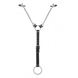 讓他顯得酷酷的另類裝飾!Y型的上端是可以咬住乳頭的金屬乳頭夾(可以調鬆緊也有膠皮保護圈,以免傷害乳頭),下方是一個套在陰囊根部(或者陰莖根部)的金屬環。中間的連接是黑色真皮帶,可以調節鬆緊。